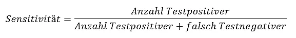 Beschreibt die Fähigkeit eines diagnostischen Tests, Erkrankte als solche zu identifizieren. Die Sensitivität steht in Verbindung mit der Spezifität – ein 100 % exakter Test existiert nicht, sodass es sowohl falsch-positive als auch falsch-negative Testpersonen geben wird.